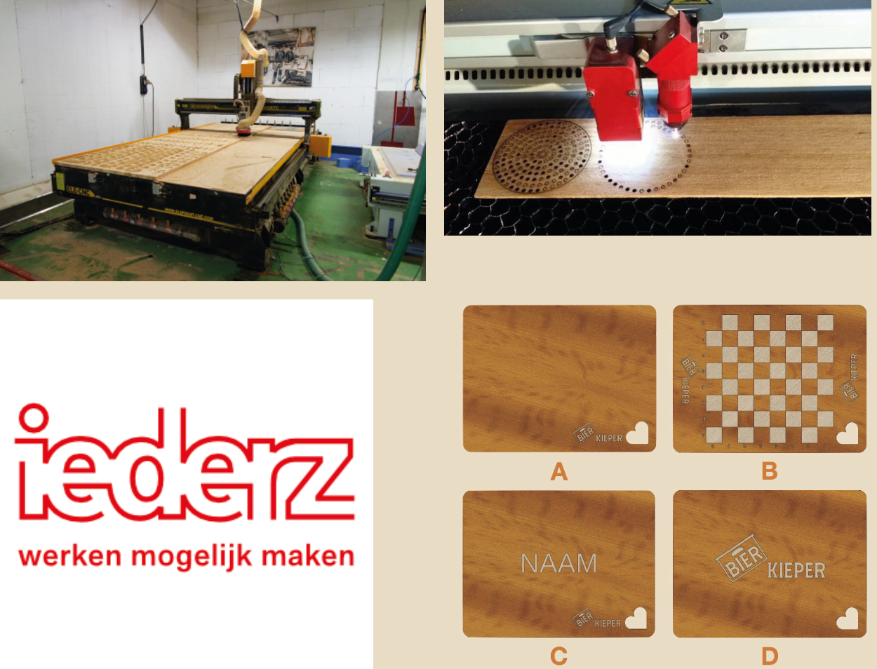 Het productieproces besteden wij grotendeels uit aan sociale werkplaats Iederz te Groningen. Zij maken gebruik van een moderne CNC-frees die de gleuven aan de onderkant van De Bierkieper freest, dit is allemaal computergestuurd en gebeurt dus snel en efficiënt! Mocht je er voor kiezen om een logo, naam of dambord op je Bierkieper te willen, dan zullen we dit voor je graveren met een lasersnijder. Dit is de duurzaamste optie en zo blijft de Bierkieper ook lang mooi.
